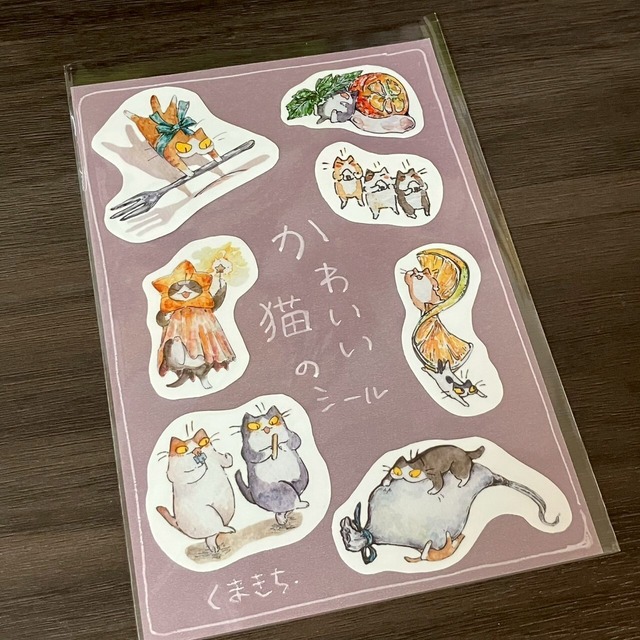 【かわいい猫のシール】 かわいい猫さんを過去のイラストからトリミングして作ったシール。 どのイラストからの切り抜きか分かった方はくまきちファンです、ありがとうございます。 インクジェット印刷、台紙ハガキサイズ