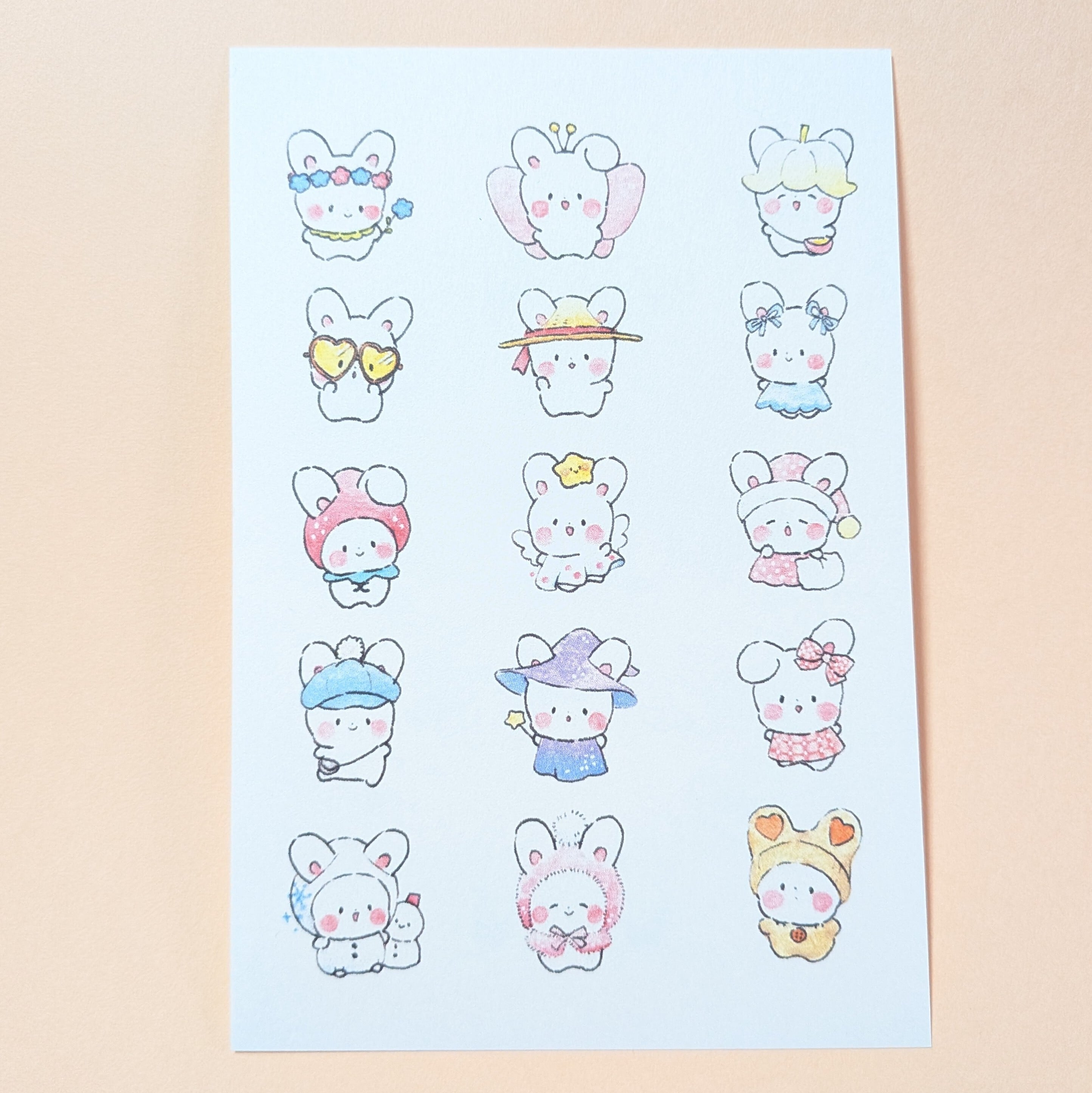 色んなおめかしをした こうさぎちゃんのイラストのポストカードです。