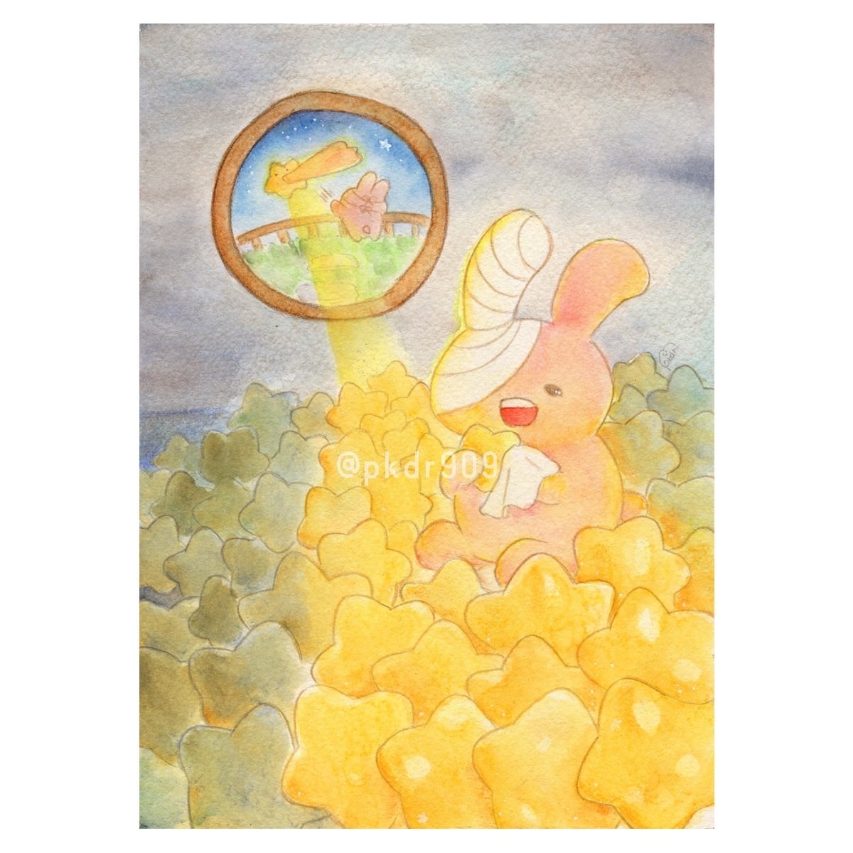 流れ星の残骸を磨いてるうさぎのポストカードです。